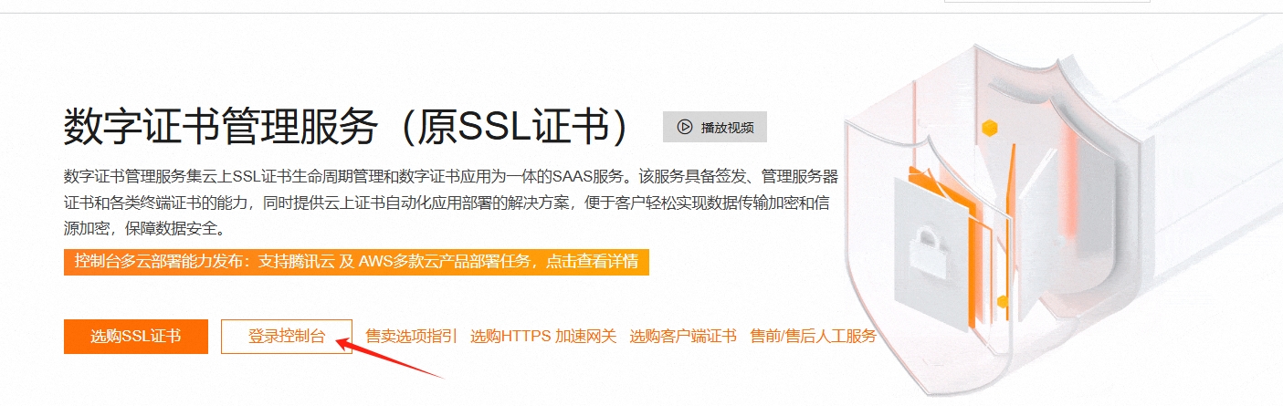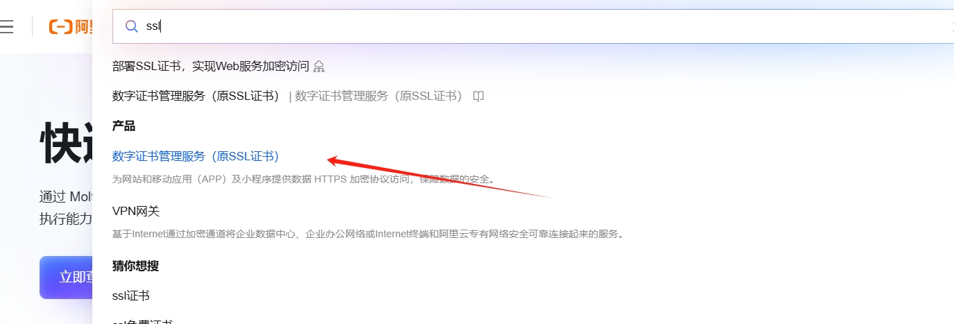 到阿里云官网首页,输入SSL,选择【数字证书管理】,然后登录控制台