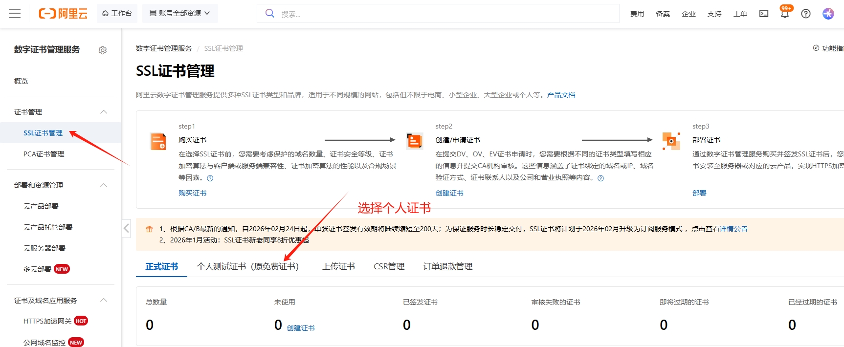 点击【SSL证书管理】,选择个人证书