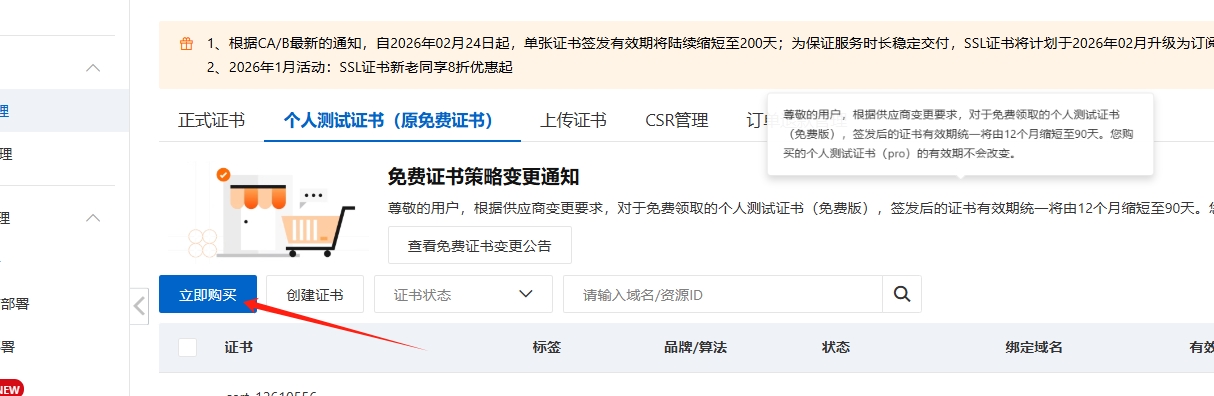 选择【个人测试证书pro】,选择6个月有效期,然后下单购买