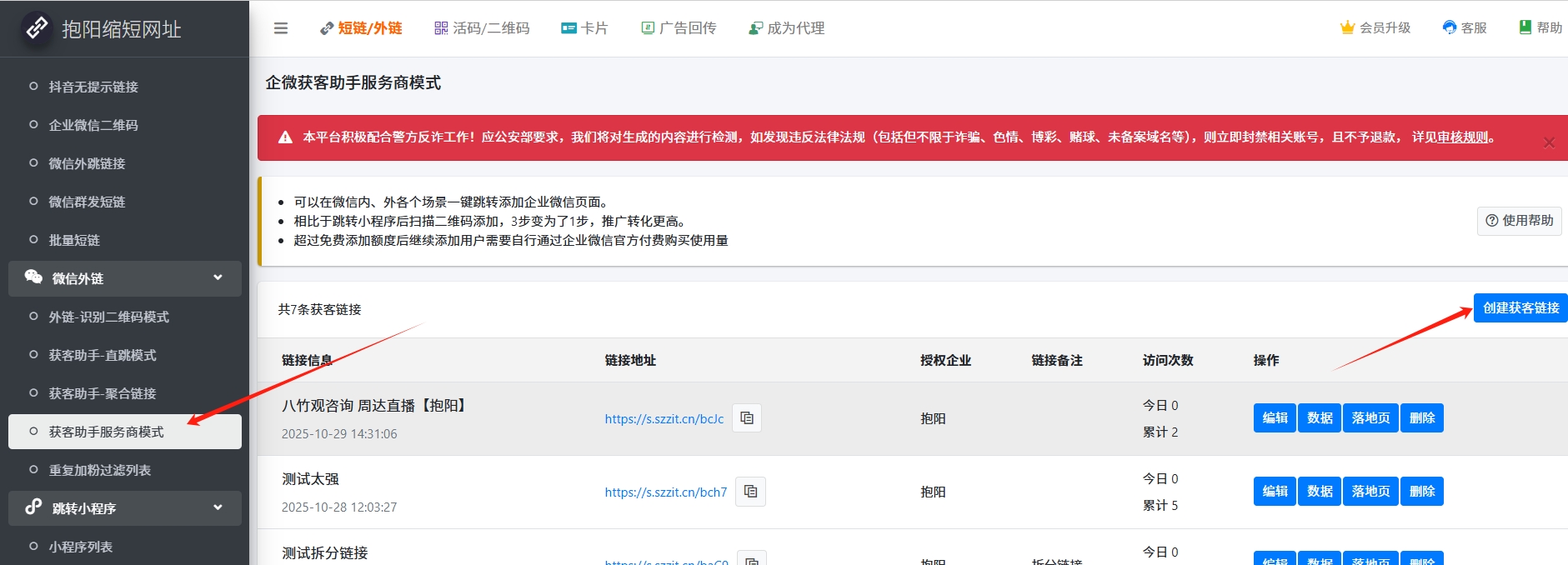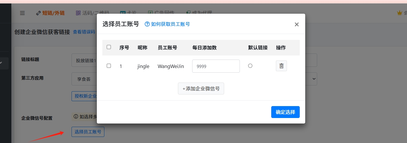 选择获客链接的员工,可以设置每个员工的加粉限额。【默认链接】--表示此员工为兜底员工,全部员工加粉都超过限额后,使用此员工为加粉;每个员工按设置的加粉限额,轮流加粉。
